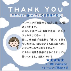 姫路スタジオは、とても和やかな雰囲気で、地域の特性なのか純粋で優しい方たちが多くいらっしゃいます。 クラスが終わると、みんなでお茶を飲みながら、レッスンの感想などを話すのですが、一緒に話していると、とても和みます。
