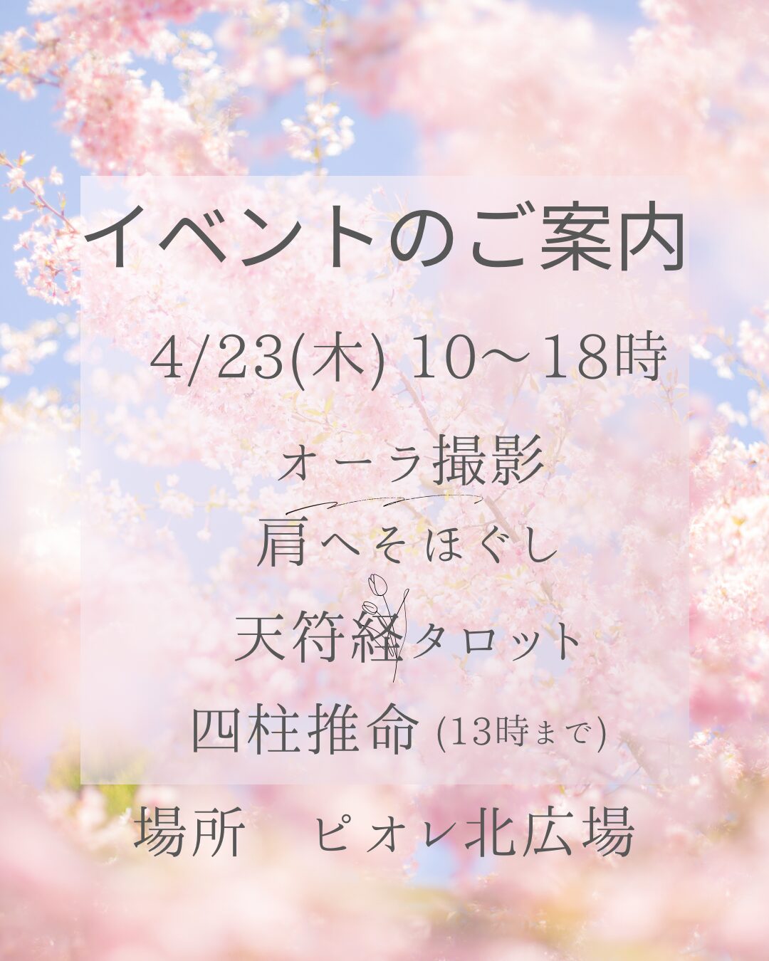内容 オーラ撮影(1500円)、肩へそほぐし(10分500円)、天符経タロット(1000円)、四柱推命(13時まで)